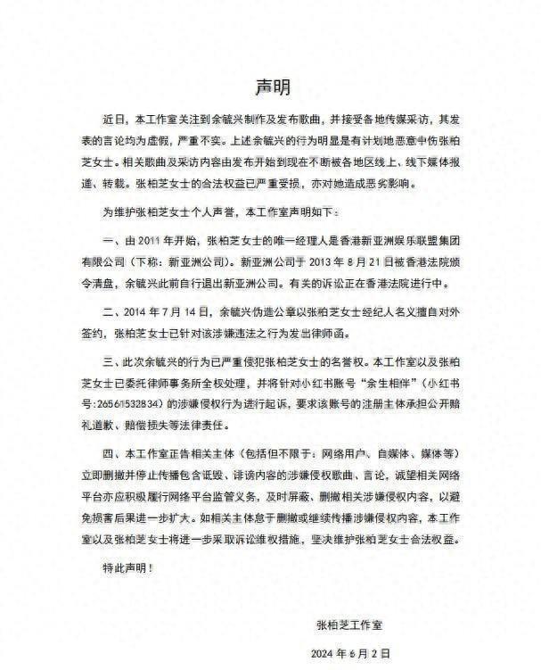 这件事其实早有迹象,三年前余毓兴发新歌《以犬之名》,歌词里提到张柏芝违约、装可怜博同情,网上当时议论纷纷,再往前到2020年,张柏芝工作室发表声明说他胡说八道,还打算告他,更早的2014年,余毓兴因为伪造公章用张柏芝名字签合同,被张柏芝方面发出律师函提醒过,这么一看,两人早就互相不信任了。